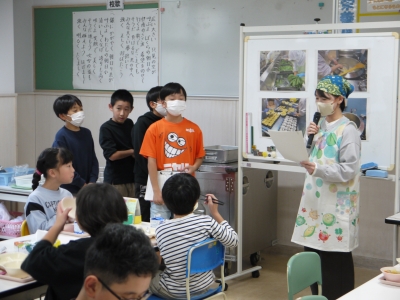 本日の給食に、給食センターの栄養技師の先生をお招きし、給食が学校に届くまでどのような御苦労があるのか、どんなお気持ちで調理されているかを教えていただきました。