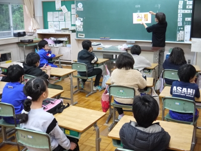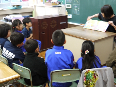 本日は朝から冷たい雨が降っていますが、学校では2校時後の中休み時間に地域の方に読み聞かせをしていただきました。