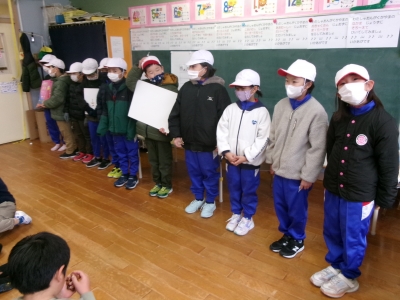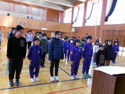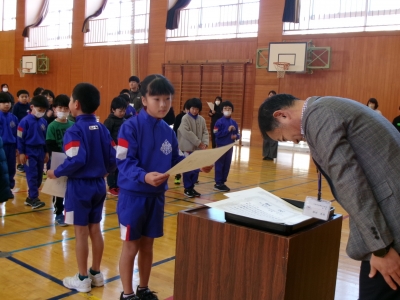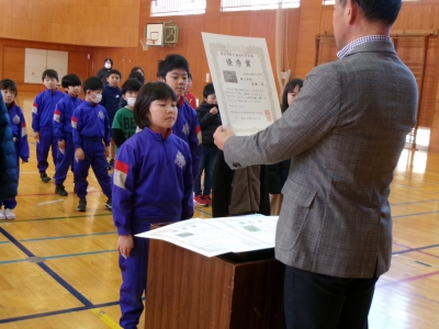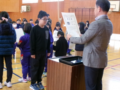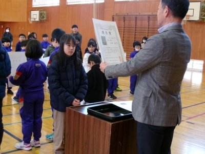 17日の全校集会で、郡作文コンクールと郡造形展の表彰を行いました。受賞者は全校生のお友達から拍手をもらい、うれしそうな表情でした。
