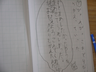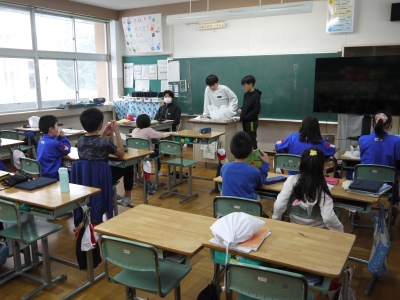 最後の場面、たぬきが帰っていくところの気持ちを想像し、お互いに発表し合っていました。