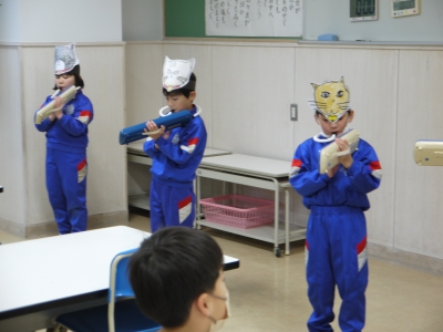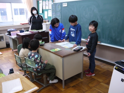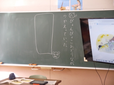 17日(水)、1年生教室から楽しそうな声が聞こえたので行ってみると、国語「たぬきの糸車」の学習でした。