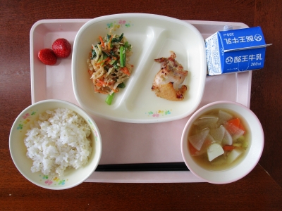 今年度の給食では最初で最後のいちごです。味わって食べてほしいです。