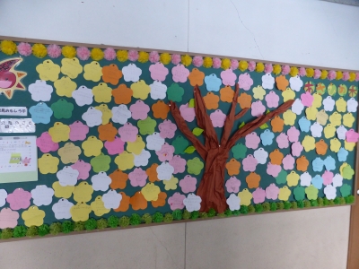 児童昇降口にある「あさひの木」には、たくさんのやさしさが書かれています。