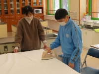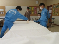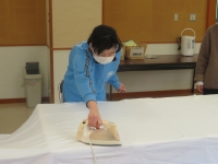 少しの休憩の後、再び家庭科室へ移動。卒業式に向けて、白布のアイロンがけを行いました。