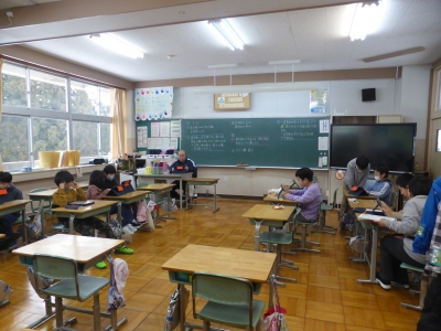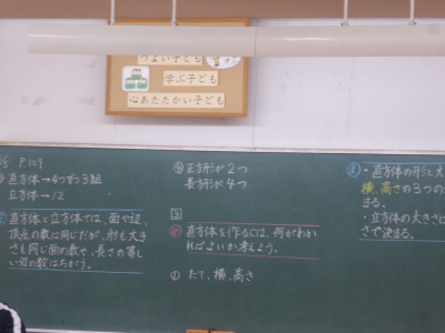 授業の前半では、直方体と立方体の学習をし、後半ではタブレットを用いて復習をしています。全員が真剣に取り組んでいます。