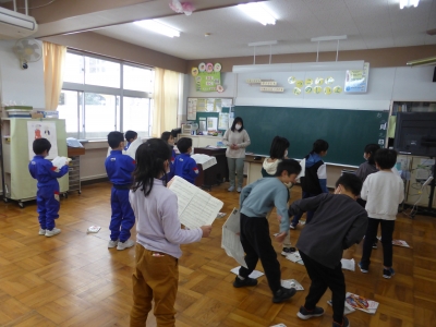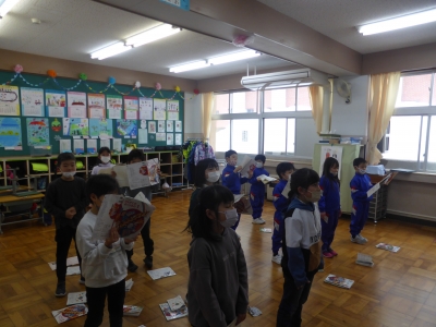 画像は,1・2年生の音楽の授業です。「君が代」「校歌」のほかに「大空がむかえる朝」を練習しました。しっかりと口をあけ,音程を正しくとる練習をしました。1年生を引っ張る2年生がとても上手です!