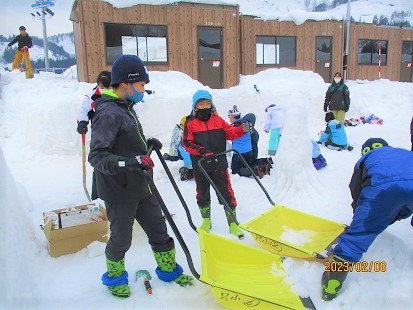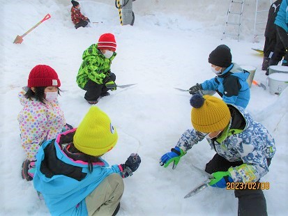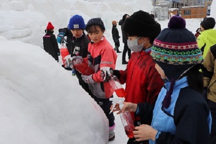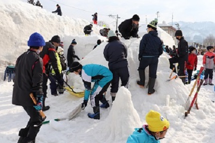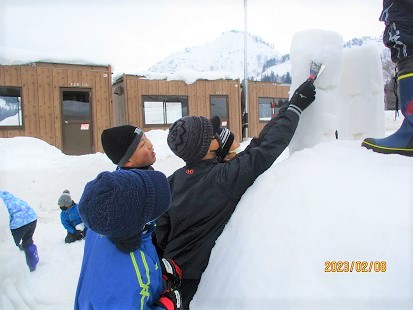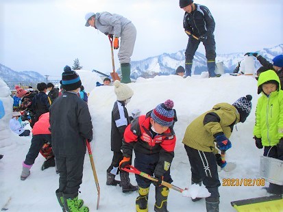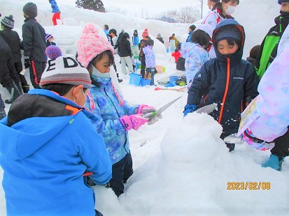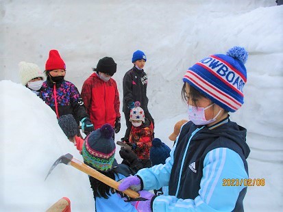 今日は雪像づくりが行われました。全校生で雪まつり会場に出かけ,雪像をつくってきました。みんなで協力して,立派な雪像を完成させることができました。