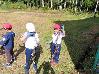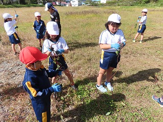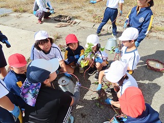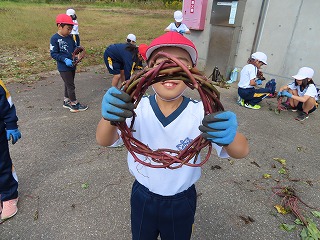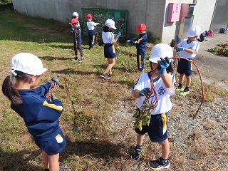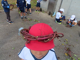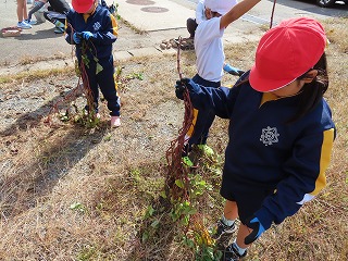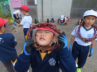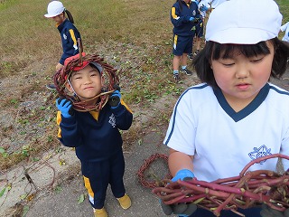 1・2年生の子ども達が生活科の時間に、サツマイモの蔓でリースを作っています。蔓から余計な葉をとり、丁寧に巻いています。みんな上手にできていますね。完成が楽しみです。