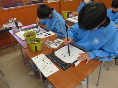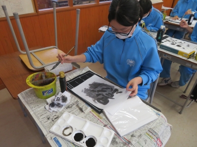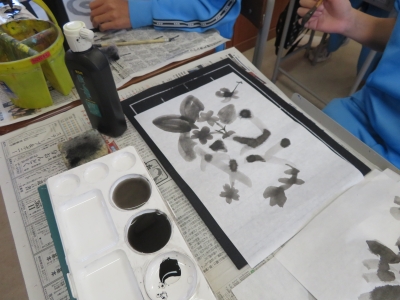 1年生は、強、弱、かすれ、にじみ等の技法を使って、水墨画に取り組んでいました。文字のイメージが伝わるように、工夫して描いていました。