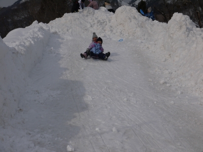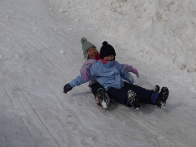 学校では、昼休みに子どもたちが元気に外に飛び出し、雪遊びをしていました。校庭の雪山は大きく積み上げられ、登って見るとながめがよく、爽快な気持ちになります。