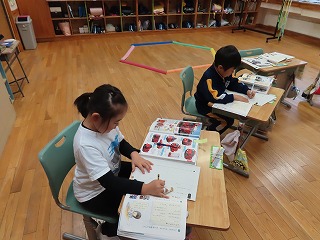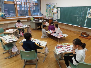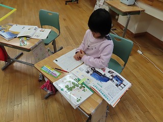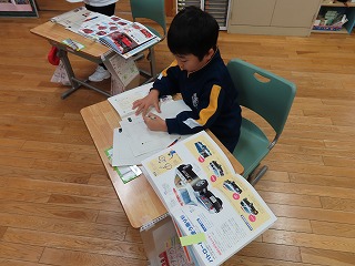 1年生の国語科「自動車くらべ」の様子です。教科書での学習を生かし、「自動車ずかん」を作っているところです。いろいろな自動車のはたらきとその構造について調べ、まとめています。