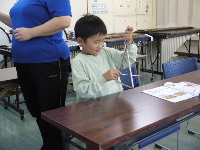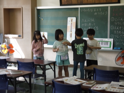 音楽室からにぎやかな楽器の音が聞こえてきましたので、行ってみると1・2年生がトライアングルやタンバリン、鈴などの楽器を使って楽しい合奏を行っていました。