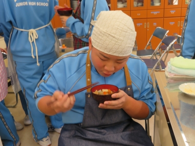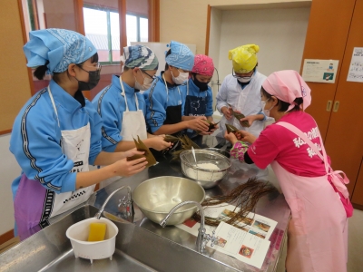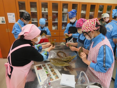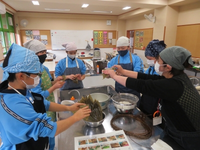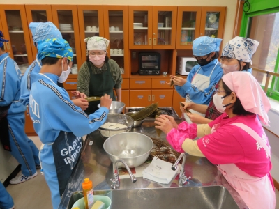 本日は1年生の家庭科の授業で調理実習を行いました。只見町食生活改善推進委員を講師にお招きし、郷土料理「ちまき」「ざく煮」を作りました。初めて作る生徒が多かったですが、上手に調理していました。