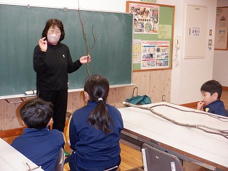 1年生が、地域の方を講師にお迎えして、小正月の伝統行事「だんごさし」を行いました。本校では、「ESDー只見学」の一環として、地域の伝統や先人の知恵を学んだり、地域の方とふれあったりすることを目的として行っています。