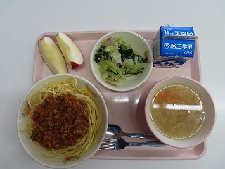 本日の給食の献立は、スパゲッティミートソース、ジュリエンヌスープ、ほうれん草のフレーク和え、りんご、牛乳でした。