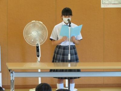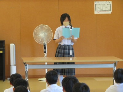 本日より2学期がスタートしました。熱中症対策として、第2学期始業式は、多目的ホールで行いました。各学年の代表生徒が夏休みの反省と2学期の抱負を発表がありました。どの生徒からも、よりよい学校生活を送れるように頑張っていきたいという熱意が伝わってきました。