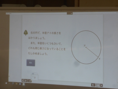 「円と球 まるい形を調べよう」の学習です。円の中心や半径について学び、半径の長さを確認していきます。そして、円の中心を見つける学習へつながっていきます。