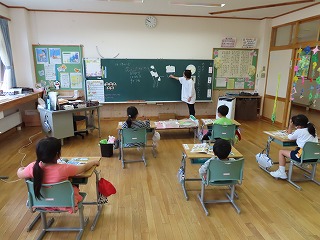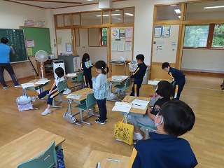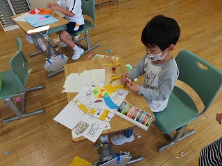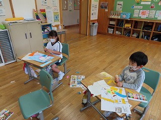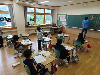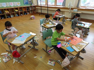 まずは、1年生の図画工作科「やぶいたかたち」です。紙を手でやぶりできた形から、お話をつくったり、想像をひろげたりする活動です。楽しそうに取り組んでいます。