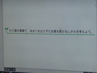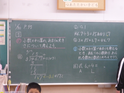 小数のわり算のあまりの大きさについて考えています。どの位まで割るのか確認することと、あまりが小数になる場合の小数点の位置を見直すことが大切です。
