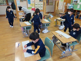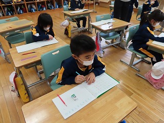1年生の朝学タイムの様子です。3つの数のたし算、ひき算の練習問題に取り組んでいます。