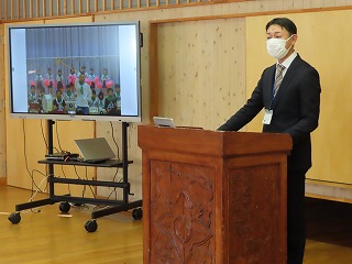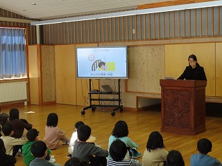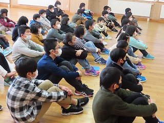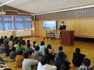 次に、校長戦からのお話がありました。校長先生は、写真を掲示しながら2学期を振り返りました。また、「形は大事」というお話もありました。