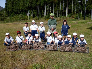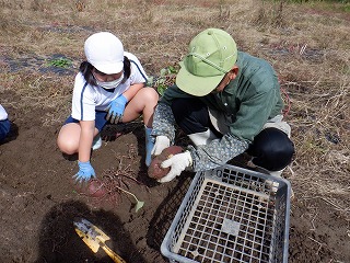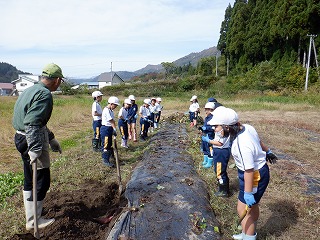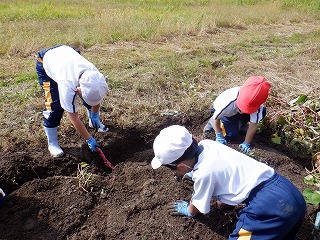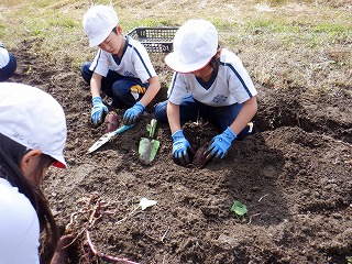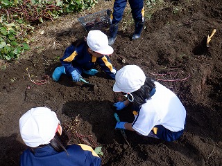 1・2年の児童が、学校の畑で、地域の農家さんからご指導をいただきながら、サツマイモ掘りを行いました。悪戦苦闘しながらのいも掘りでしたが、大きく育ったサツマイモに児童は大喜びでした。この後、サツマイモの蔓でリースを作る予定とのことです。