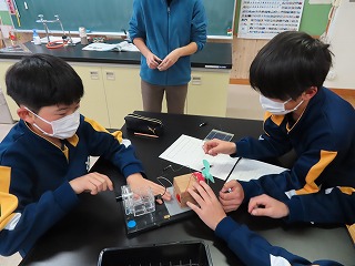 次は、6年生の理科の様子です。「手回し発電機」を使えば、発電できることを確かめています。