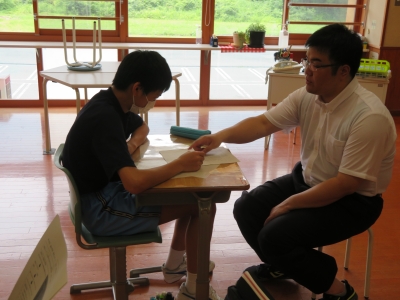 のぞみ学級では、研究テーマについての説明に向けた発表練習を行っていました。国語科の鶴巻先生とどのように説明するとわかりやすいか確認していました。