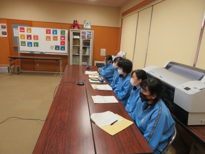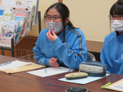 どのような海はたを作ったかについて、3年生の橋川彩希さんが質問をしている様子です。