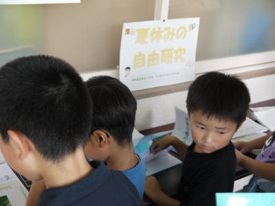 職員室前の廊下に、子どもたちが夏休みに取り組んだ自由研究(理科作品)の展示を行いました。
