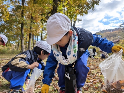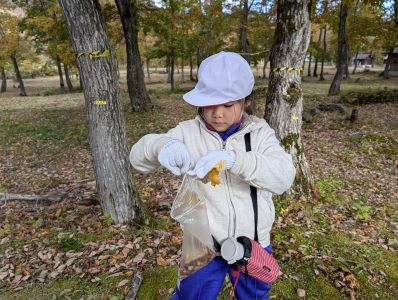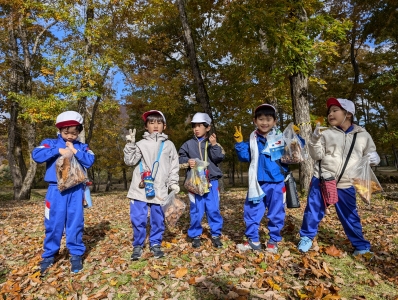 山々のきれいな紅葉を見ながら、ドングリや落ち葉を集めました。
