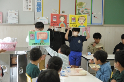 朝食をとると、頭・身体・お腹それぞれのスイッチが入り、調子よく過ごせることを子どもたちが紹介しました。