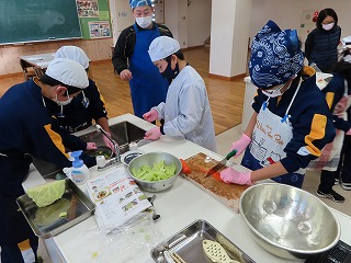 5学年家庭科「ゆで野菜をつくろう」の学習の様子です。にんじん、ブロッコリー、キャベツでゆで野菜を作っています。家庭でも実践して、家族の役に立とう。