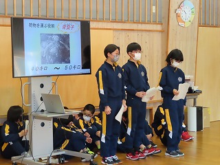 本日の全校朝の会では、地域成果発表会のリハーサルを兼ねて、校内発表会を行いました。プレゼン資料も子ども達がつくっています。