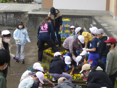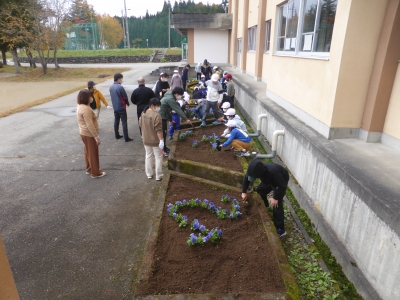 今日の仲良しタイムは花壇の植えかえです。むらさき色の花はパンジーです。上手に「あ さ ひ 」ができるかな。