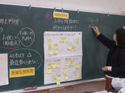 5年生は2時間目に総合の研究授業を行いました。単元名は「只見の郷土料理の深イイ秘密」です。まずは、馬場先生から教えていただいた内容を思い出して感想交流です。その後、郷土料理のお平を後世にも残していくためにどんなことを伝えていけばよいか相談しました。授業が終えた後は、先生が作ってくれた「お平」の試食もできました。