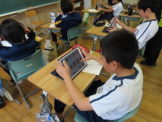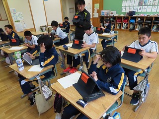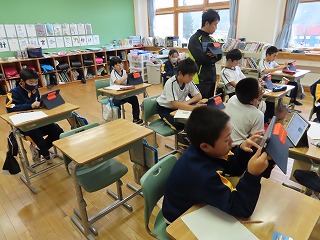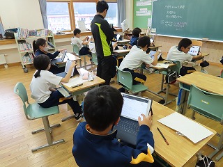 5・6年生が「只見町の課題」というテーマで学習に取り組んでいます。写真は、TabPCを使って、只見町HPや「広報ただみ」から、必要な情報を収集している様子です。
