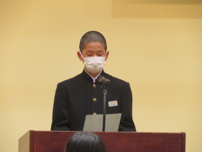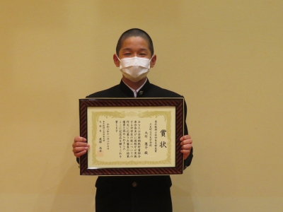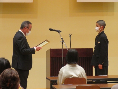 只見中学校からは、2年生の大竹蓮斗くんが、「東北税理士会田島支部長賞」を受賞し、全員の前で