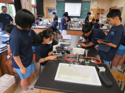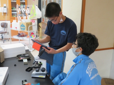 2年生は理科の授業で、顕微鏡の使い方を確認していました。顕微鏡を使って、水中の生物や葉、石等いろいろなサンプルを観察していました。タブレットを上手に使って、写真を撮って記録を残している生徒もいました。