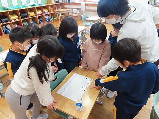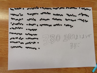 1学年算数科「おおきいかず」の学習の様子です。生活科で栽培したアサガオの種を実際に数えます。数が多くてかぞえにくい種をどうやったら正しく数えられるか、子ども達は、試行錯誤しながら学習を進め「10のまとまりにするとよい」という、納得解にたどり着きました。