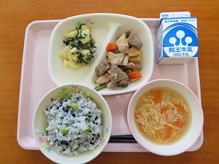本日の給食のこんだては、枝豆ごはん、かきたま汁、筑前煮、アーモンドみそ和え、牛乳です。