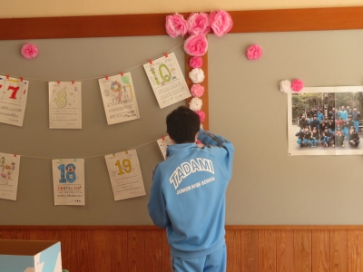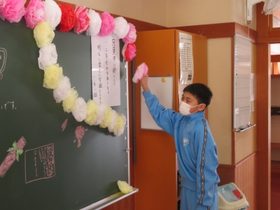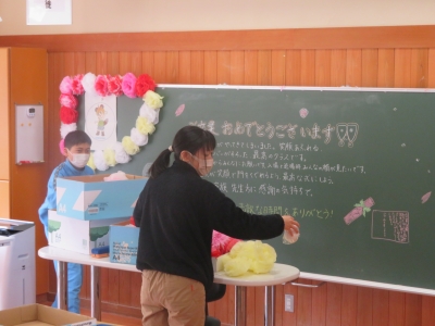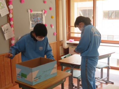 3年生教室の片付けを行っています。おはながみで作った花を色別に分けています。また、セロテープをきれいに剥がしています。