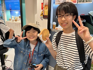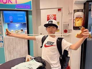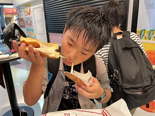 あいにくの雨ですが,10円パン(500円)などグルメを味わったり,お面の絵付けをしたり楽しんだようです。おいしそう!!