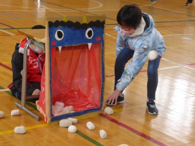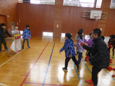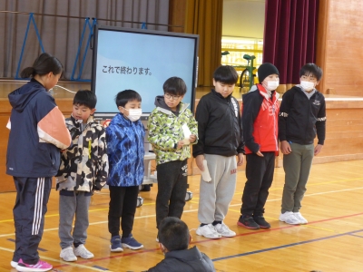 今日の全校集会は「豆まき集会」です。追い出したい鬼について学年代表が発表した後,なかよし班対抗ゲームで楽しみました。子どもたちそれぞれが追い出したい心の鬼については,教室前廊下に掲示してあります。