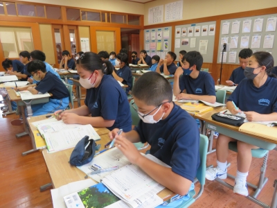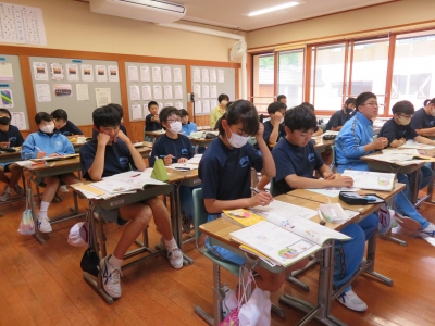 1年生の英語の授業では、ワークシートの日本文を英訳しました。「3単元のS」に気を付けながら、英文にしていました。