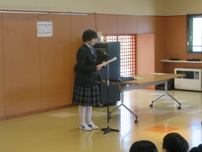 規律委員会からは、冬期間の登校時における服装についての確認があり、最後に「しっかりきまりを守り、みんなが過ごしやすい学校にしていきましょう。」と呼びかけていました。