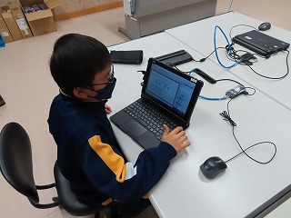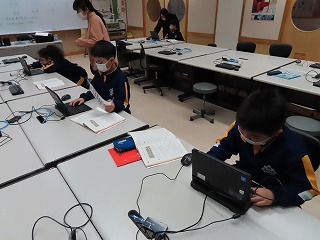 3年生の児童が、PC室で学習をしています。学習内容は「コンピュータのローマ字入力」です。子どもたちは、コンピュータのワープロソフトを使って、名刺作りに挑戦中です。