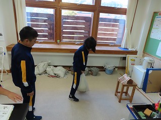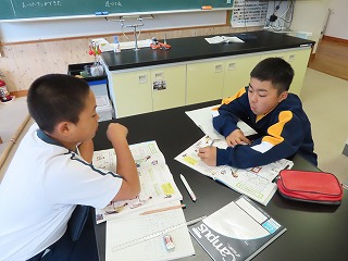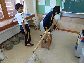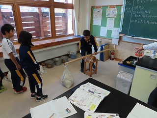 6年生の理科「てこのはたらき」の様子です。実際に重りを持ったり、いろいろな方法を試したりしながら、実感を伴った理解になるように授業を進めています。