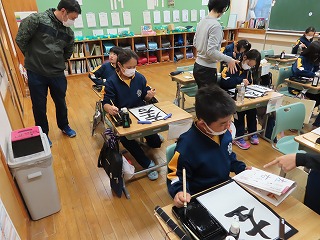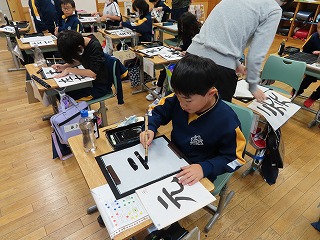 3・4年生の書写の様子です。3年生は「元」、4年生は「左右」という文字を書いています。