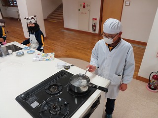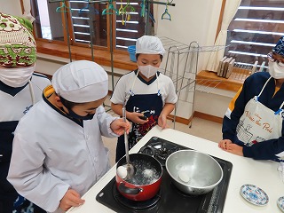 5学年家庭科「ゆでたまごをつくろう」の学習の様子です。好みの硬さのゆでたまごを作るために、時間を図りながら茹でています。好みのゆでたまごができたかな。